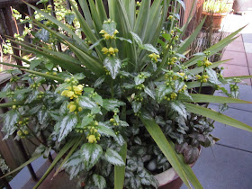 The other plant that is in bloom now is Lamiastrum galeobdolon, commonly called the Yellow Archangel. Galeobdolon is no friend of the King County Noxious Weeds folks; they describe it as a non-designated Class C noxious weed. Before learning about its noxious behavior we did have some in our yard but have since removed all traces except for the display here which is in a pot with a yucca. It can’t spread by stem fragments in the current situation, but theoretically could by seed.