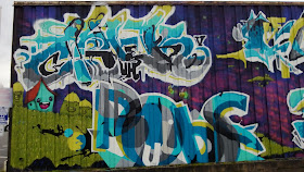 The mural on the part of the wall farthest from the N 45th is by the artist is Carlos G. Guilar and he appears to call the mural Wallingford’s Happy Home. The mural features happy, if not slightly spooky, houses and haystacks (at least to my eyes). Four words appear and one, if I squint my eyes the right way, looks like Poulsbo. Is there an inside joke here?
