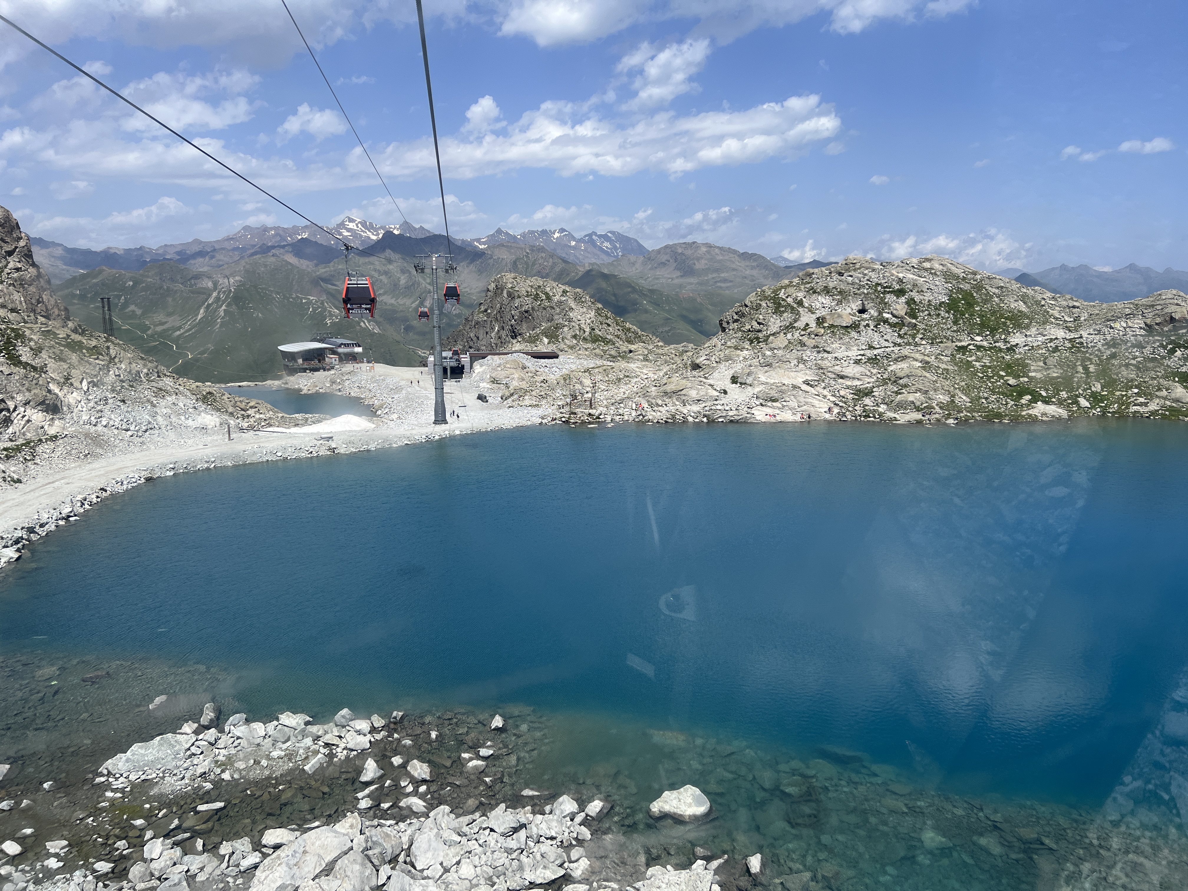 We’ve skied on the glacier in winter and were curious to see what it looked like in the summer. On an unusually hot day in July, we take the cable cars up to 3,000 m riding over the covered glacier, which looks like it was tucked into bed. It’s weird to not be dressed in ski gear. It’s weird it’s so warm.